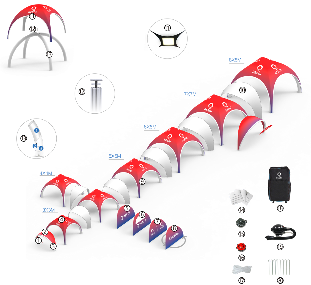 Inflatable Tent X Shape Configuration:①: Inflatable Tent Awning Banner ②: Inflatable Tent Awning Roof ③: Inflatable Tent Awning Air Tube ④: Inflatable Tent Roof ⑤: Inflatable Tent Side Wall ⑥: Inflatable Tent Window Wall ⑦: Inflatable Tent Door Wall ⑧: Inflatable Tent Custom Wall, It Can Be Double Sided Printing Wall, Big Window Wall, PVC Clear Wall, Half Wall, Etc ⑨: Inflatable Tent Canopy Zipper Cover ⑩: Inflatable Tent Connection ⑪: LED light ⑫: Aluminum Bolt ⑬: Inflatable Tent Air Tube With PVC Tarpaulin Protected Bottom ⑭: TPU Repair Tape ⑮: Inflation Valve ⑯: Over Pressure Valve ⑰: Anchor Rope ⑱: Wheel Bag ⑲: Air Pump ⑳: Secure Stake . | ![]() |